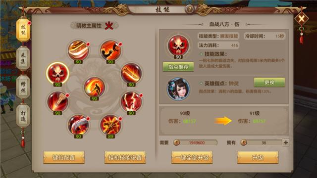 使用无崖子指点后,怒火连斩持续16秒或者10次攻击,我们在打到第8次之后,可以考虑用血战八方来收尾,其实即使不是群攻击,是单体输出,我们也可以考虑用血战八方收尾,因为血战八方的攻击力比烈焰刀要高。